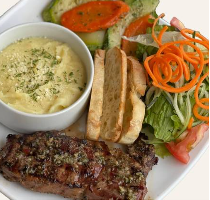 Tira de asado de 250 g acompañada de papas fritas y vegetales asados, viene con pan de la casa y chimichurri.