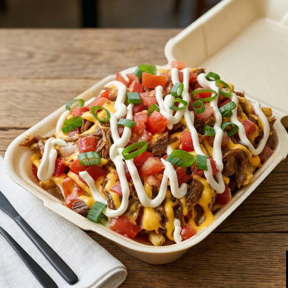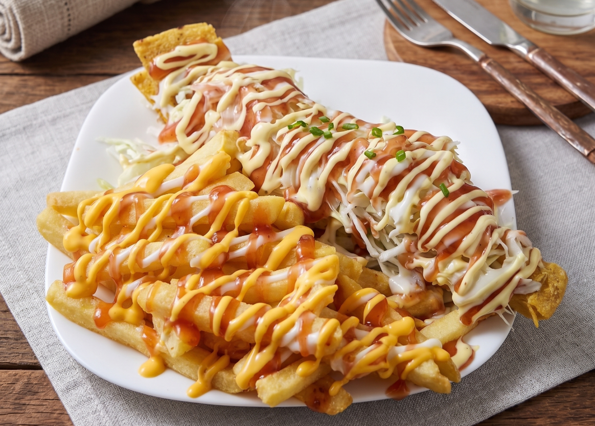 papas salsas de tomate mayonesa natilla carne molida tomate cebollino mas refresco natural