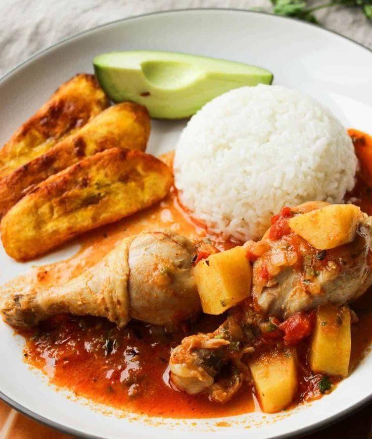 Arroz, pollo en salsa, plátano maduro, aguacate te frio.