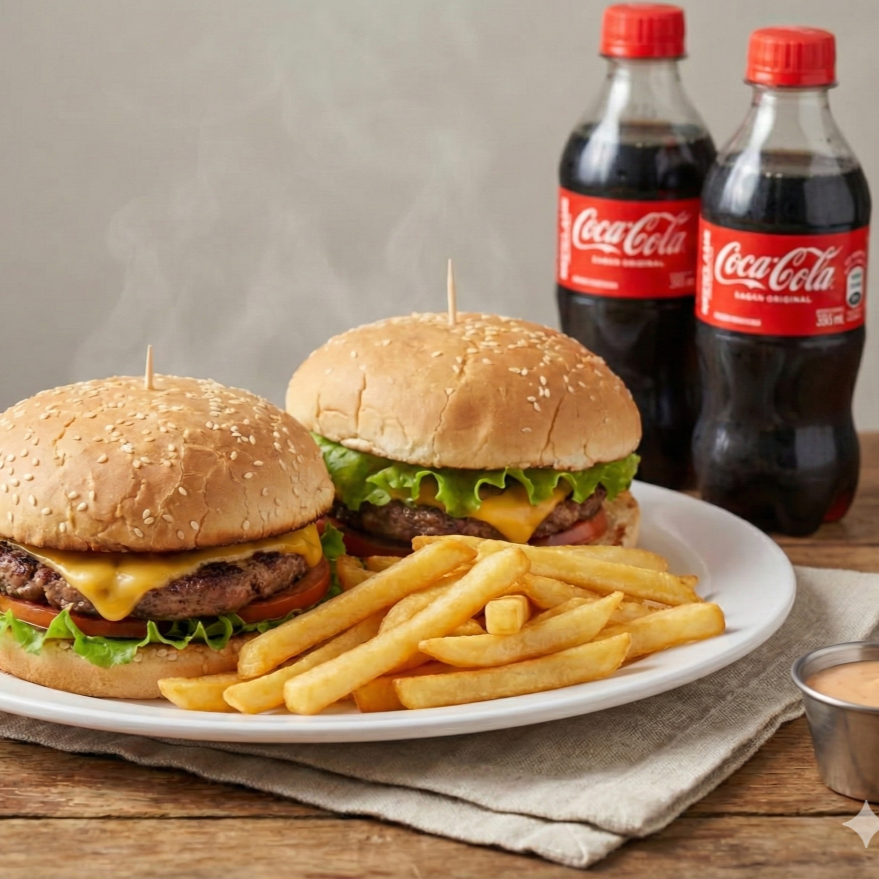 2 Hamburguesas + 2 Papas Fritas + 2 Coca Cola 355m