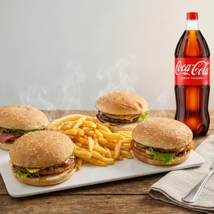 Ingredientes de la hamburguesa: pan, torta a elegir, lechuga, tomate y salsas, incluye papas familiares y Coca Cola 1.5L