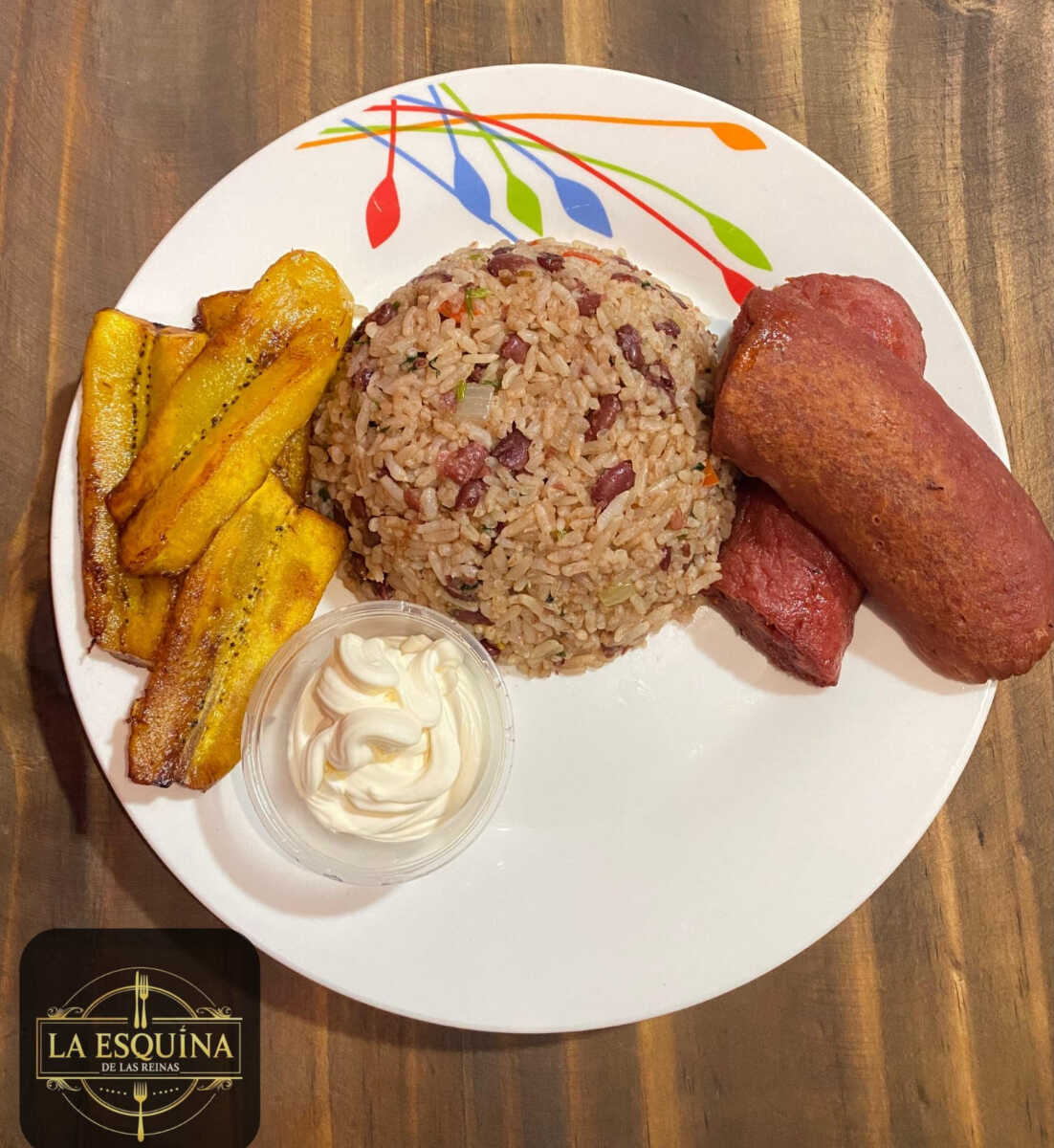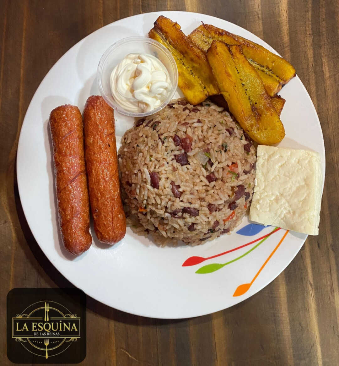 Pinto, plátano maduro, salchichas, queso, natilla, incluye pan mas café.