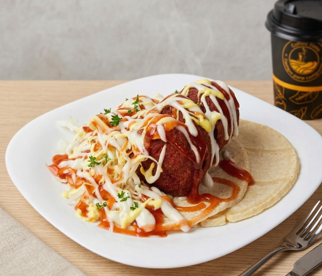tortilla con ensalada de repollo y salsas, acompañado de una bebida a elegir.