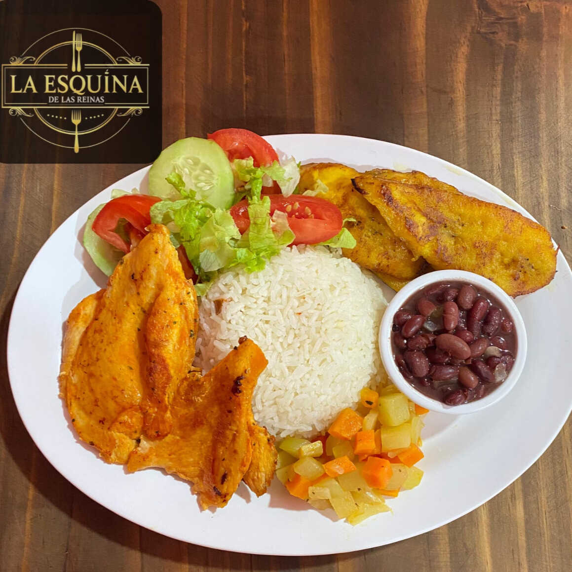 Arroz, frijoles, picadillo, plátano maduro, ensalada, carne a escoger mas gaseosa pequeña 355 ml.