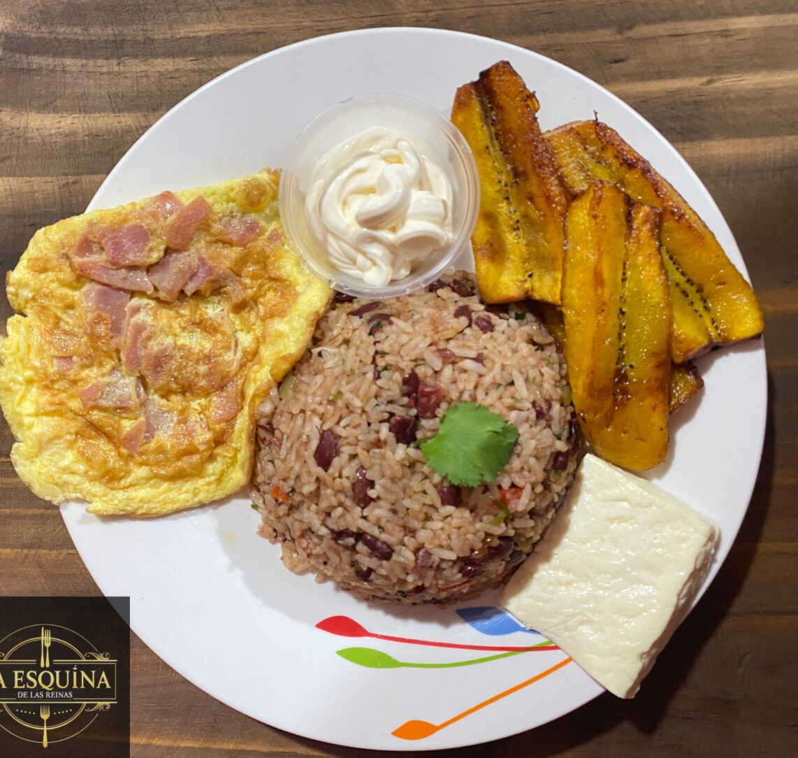 Pinto, plátano maduro, omelette con jamón, queso, natilla, incluye pan mas café.