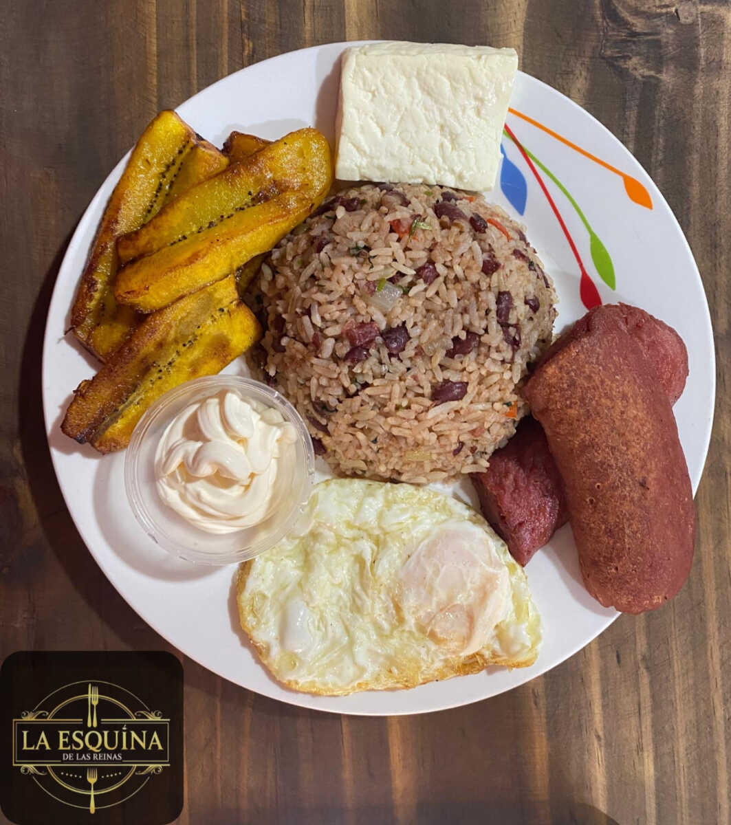 Pinto, plátano maduro, salchichón, queso, natilla, incluye pan mas café.