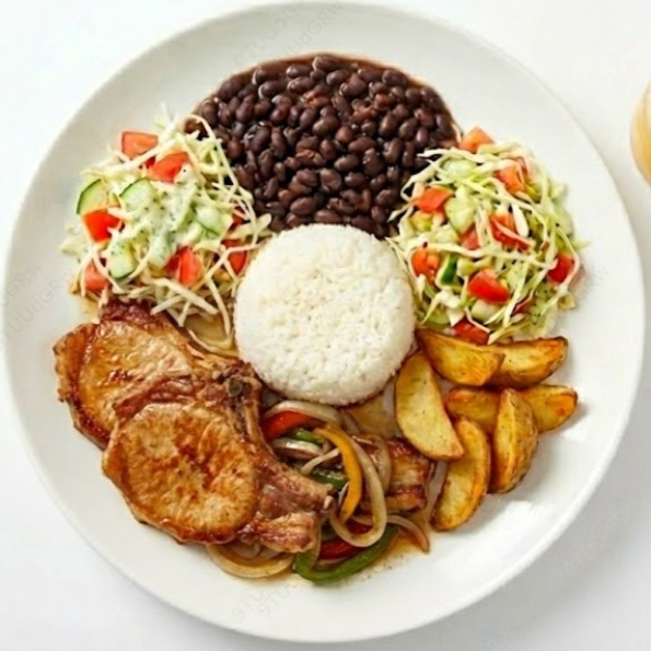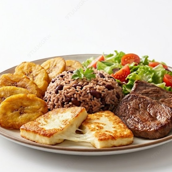 Incluye arroz frijoles ensalada guarnición proteína y bebida natural.