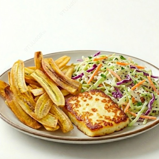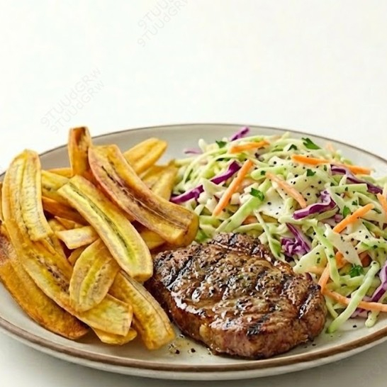 Platanitos tostados con pinto queso frito ensalada y carne.