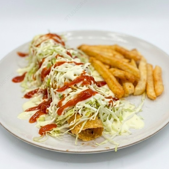 Salchipapas pequeñas con queso cheddar salsa de tomate mayonesa y queso molido.