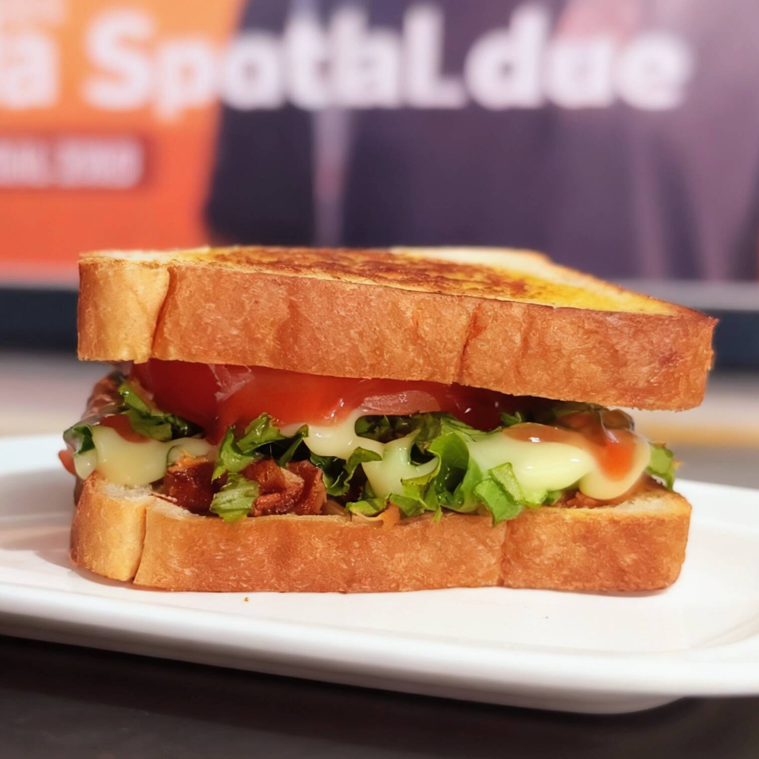 pan cuadrado, jamón y queso,lechuga,tomate y salsa