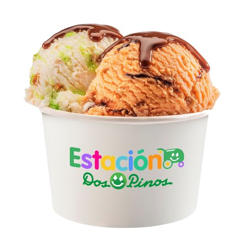 La combinación de helado a elegir y deliciosos trozos de frutas, con topping de crema chantilly y maní.
