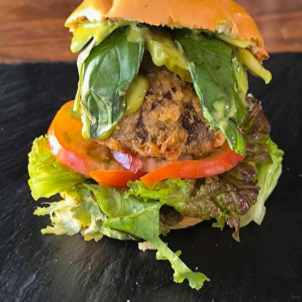 Pan artesanal, lechuga, hongo portobello empanizado, tomate, pepinillos, cebolla morada, aderezo de culantro y albahaca. Acompañada de papas.