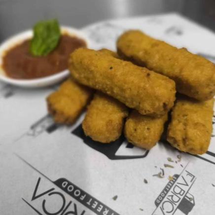 6 palitos de queso rellenos de queso mozzarella, con salsa pizza.