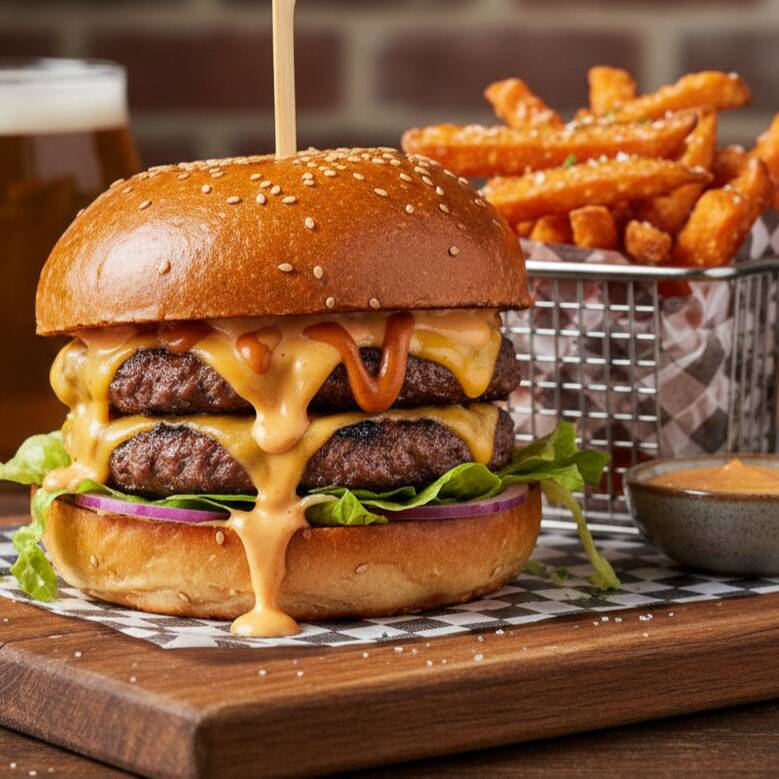 Pan artesanal, lechuga, dos tortas 100% de carne (un cuarto de libra), doble queso americano, tocino y salsa BBQ. Acompañada de camotes al romero.