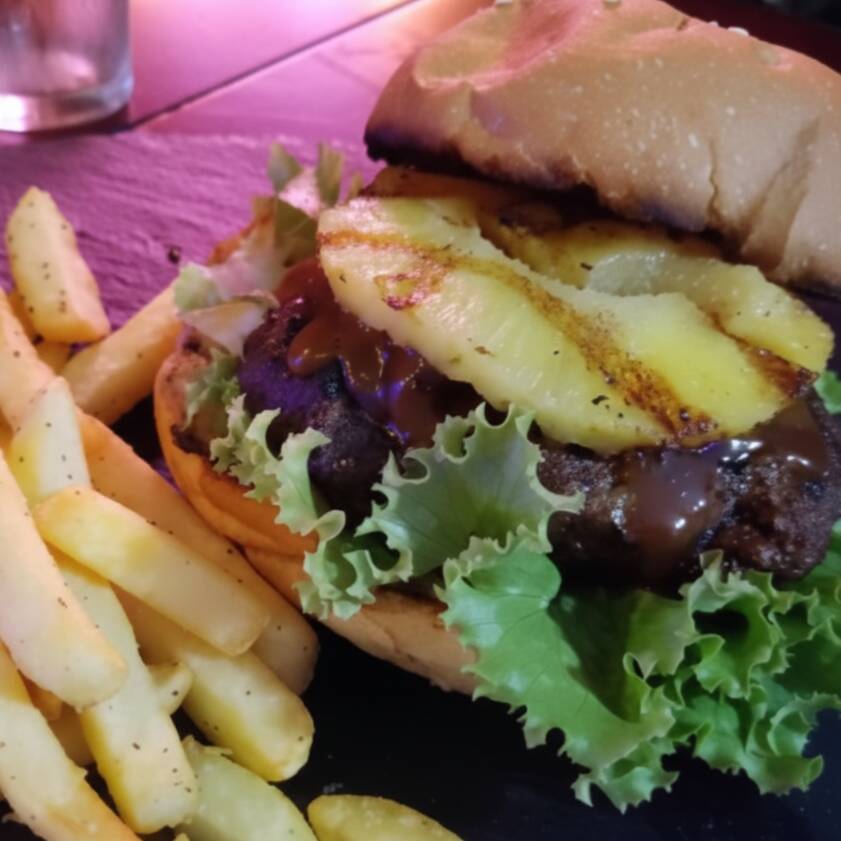 Pan artesanal, lechuga, torta 100% de carne (un cuarto de libra), barnizada con salsa BBQ y una rodaja de piña a la parrilla. Acompañada de papas.
