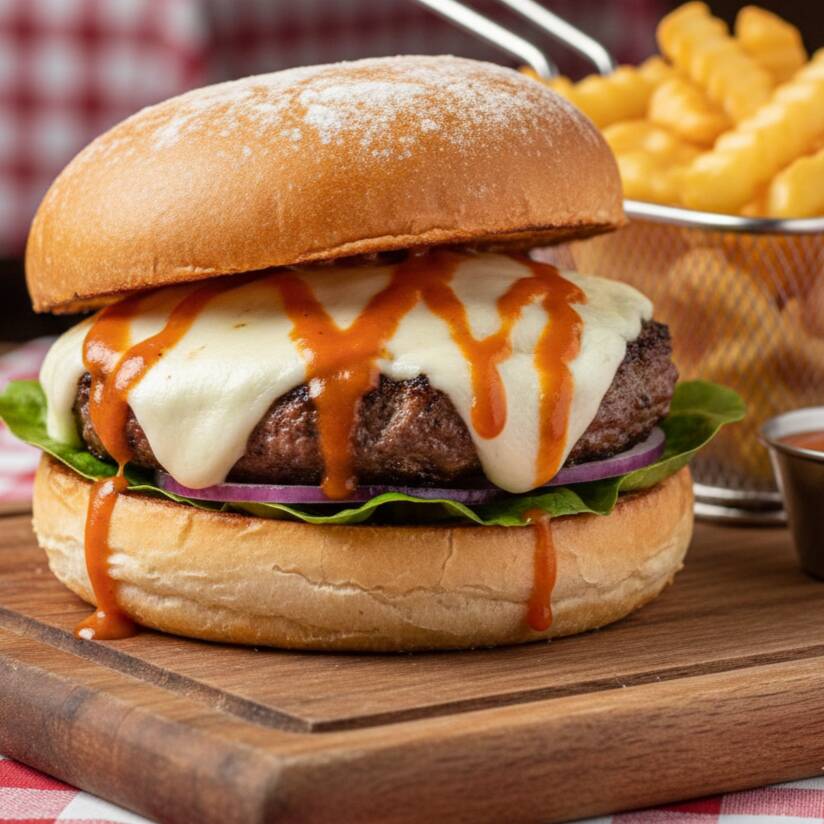 Pan artesanal, torta 100% de carne (un cuarto de libra), queso mozzarella y salsa Buffalo. Acompañada de papas.