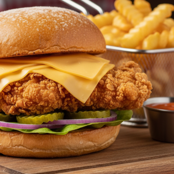Pan artesanal, lechuga, cuatro dedos de pollo empanizados, mostaza miel, cebolla crispy y pepinillos. Acompañada de papas.