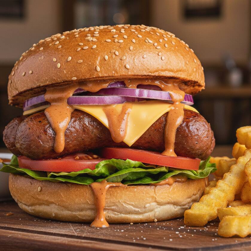 Pan artesanal, torta 100% de carne (un cuarto de libra), salchicha, chile jalapeño, queso americano y huevo frito. Acompañada de papas. Picante.