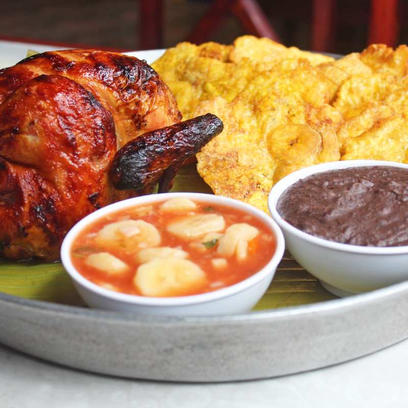 Cuarto de pollo asado acompañado de patacones, frijoles y ceviche de plátano. Incluye bebida natural pequeña