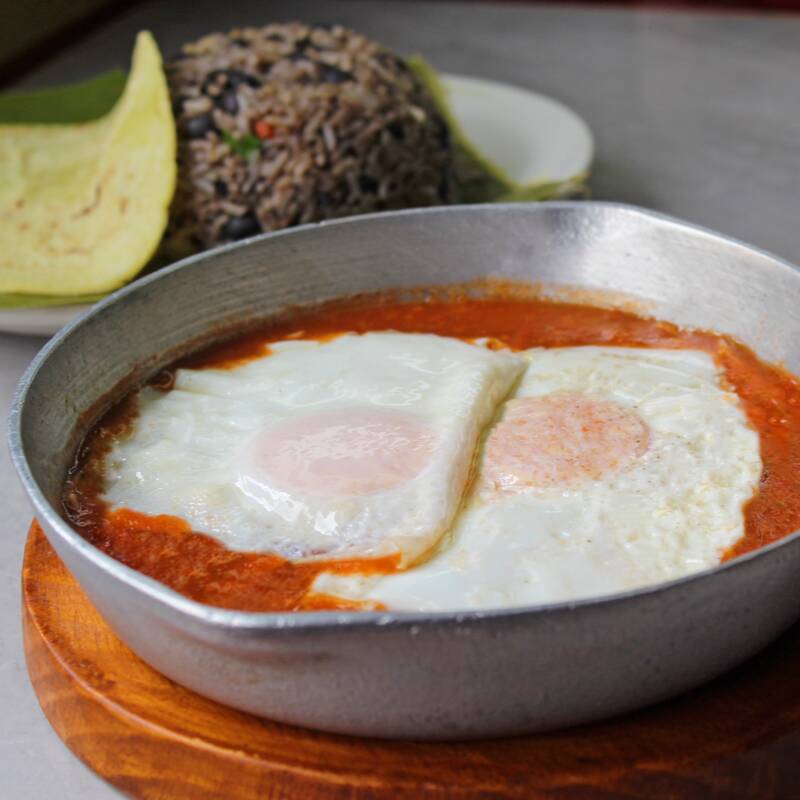 Pinto con huevos fritos bañados en salsa de tomate natural con un toque de picante.
