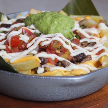 Cama de papas fritas cubierta de frijoles molidos, queso cheddar, pico de gallo, guacamole y tu carne preferida