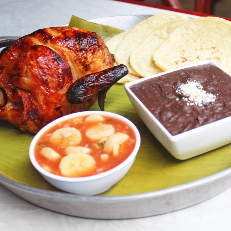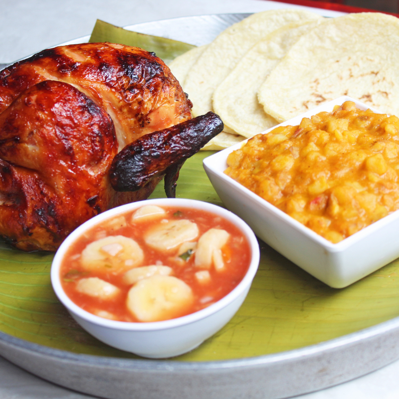 Medio pollo a acompañado de tortillas y ceviche de plátano