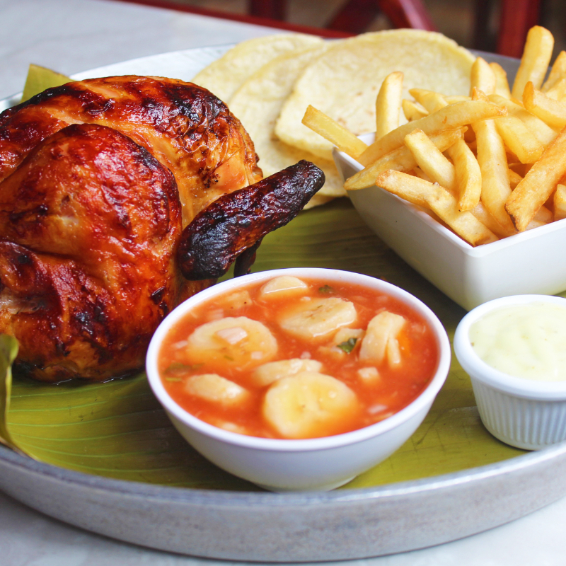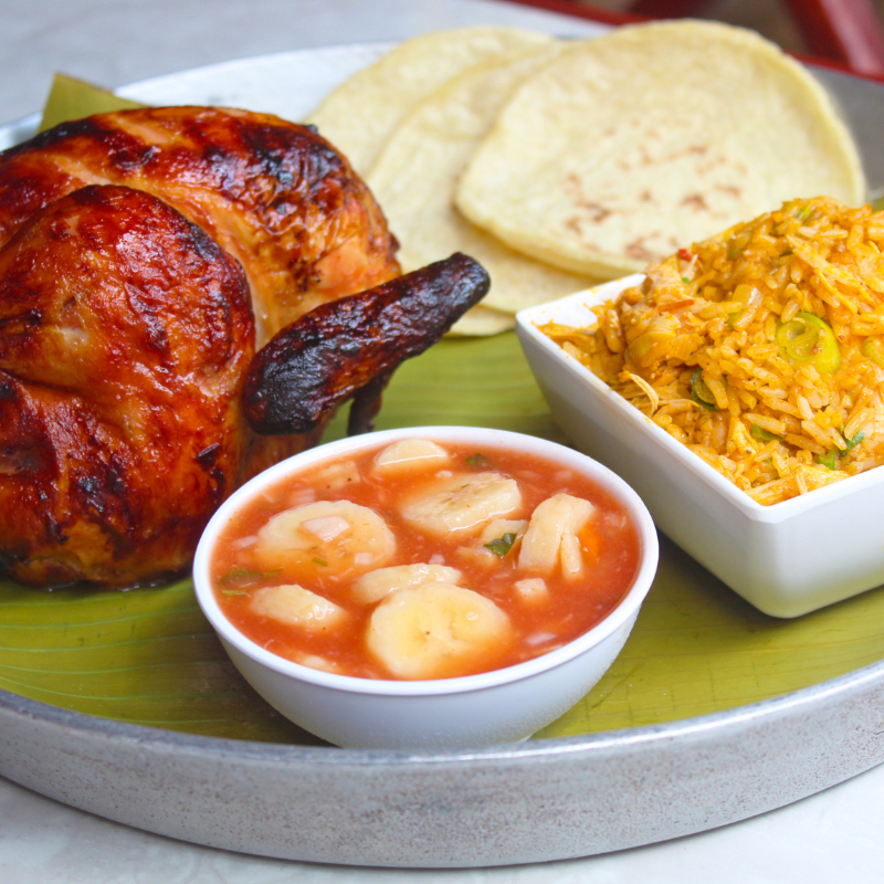 Pollo entero acompañado con yuca frita, ceviche de banano y tortillas