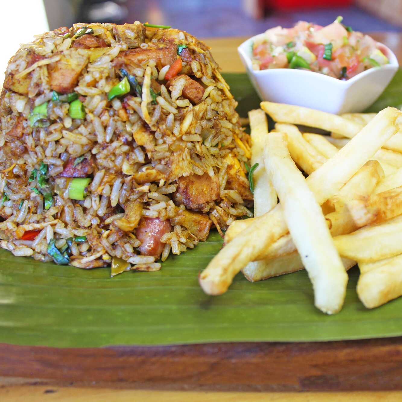 Delicioso arroz con pollo y cerdo, acompañado de papa fritas y pico de gallo.