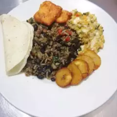 1 porción personal de orden de gallo pinto 4 oz, acompañado con 1 tortilla de maíz , huevo picado, queso frito, salchichón y 2 tajadas de plátano maduro. Plato personal