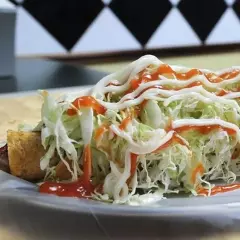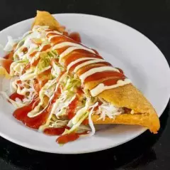 2 tortillas tostadas, frijoles molidos, lechuga, pico de gallo, salsa queso, salsa tomate y mayonesa.