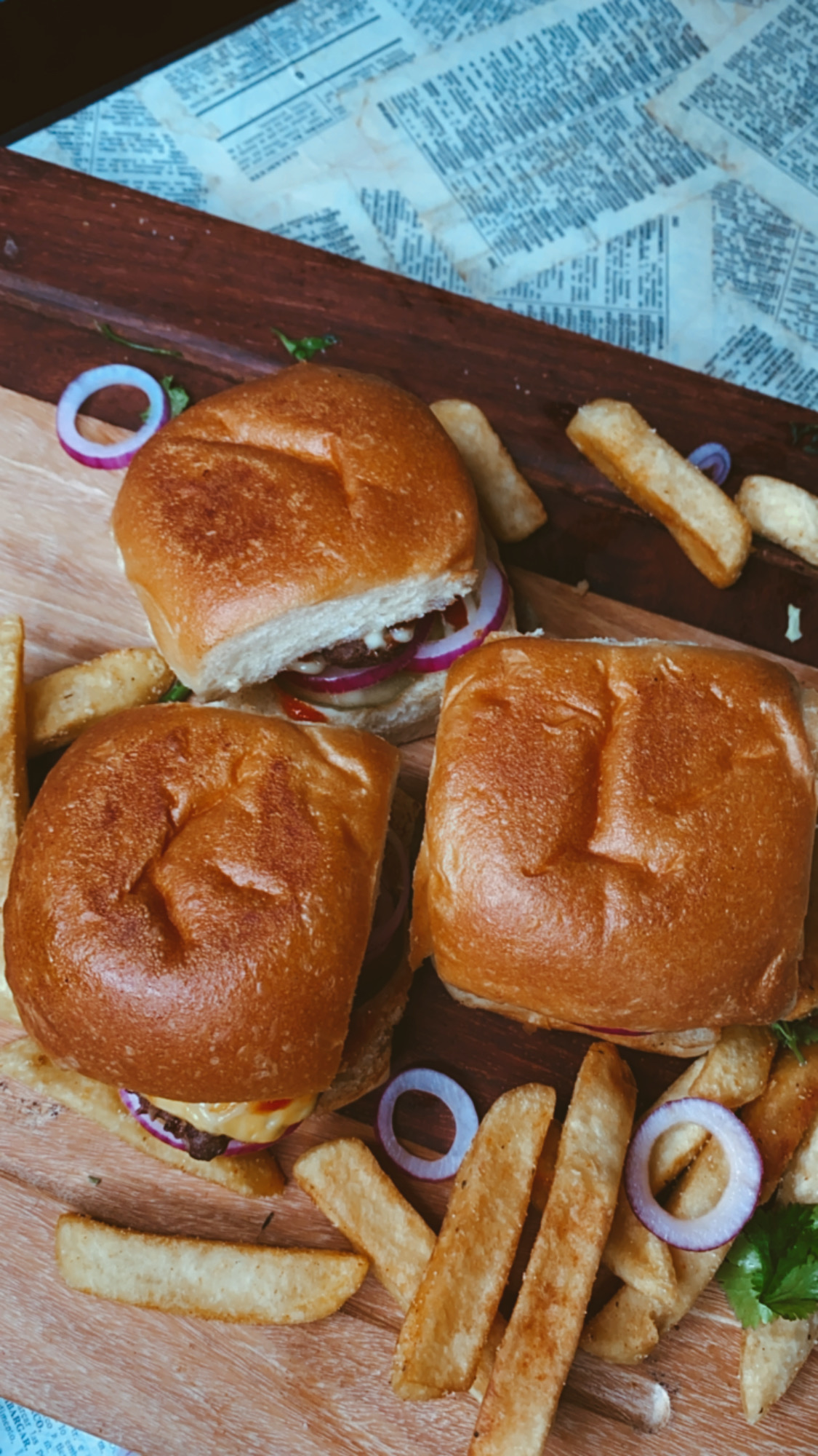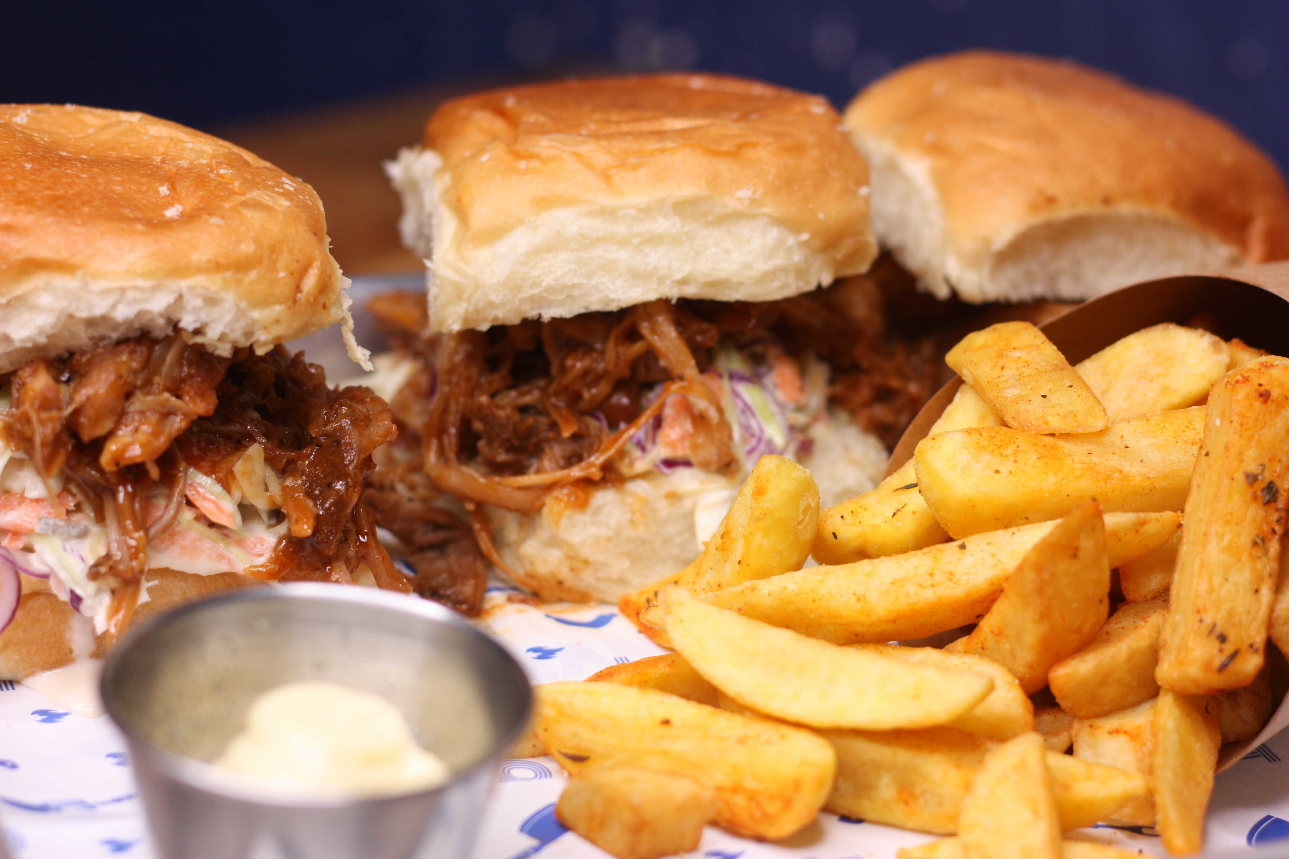 Slider de nuestro delicioso cerdo ahumado por 8 horas, salsa BBQ, coleslaw, pepinillos, cebolla morada. Acompañado de papas fritas.