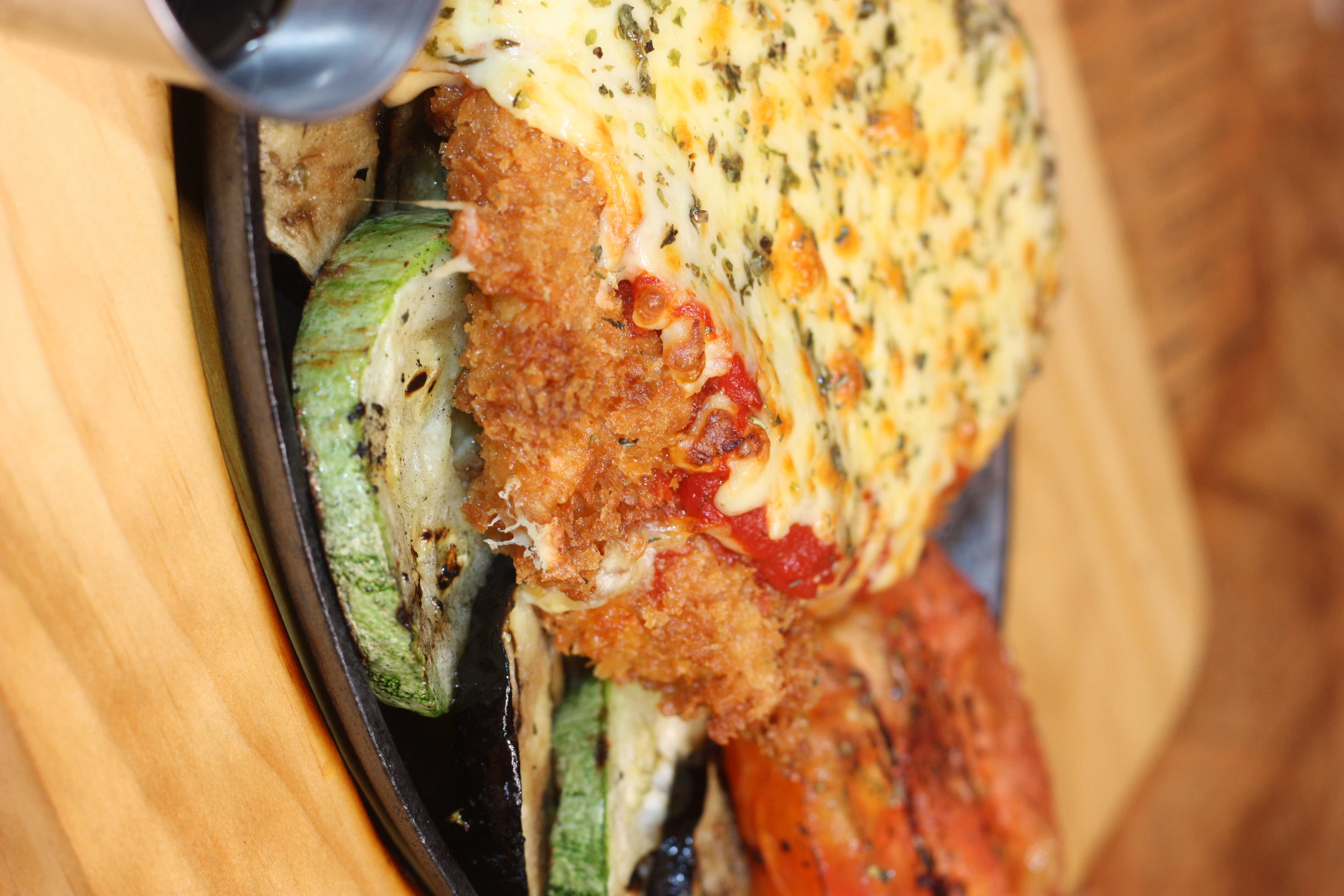 Deliciosa milanesa de pollo cubierta con una capa de salsa pomodoro y queso derretido, acompañada de vegetales a la parrilla y papas fritas.