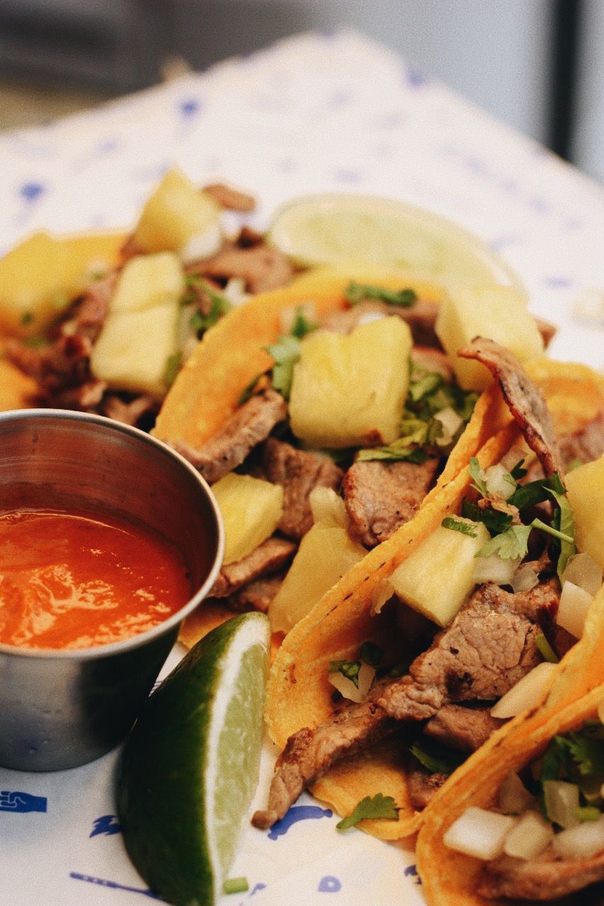 Cuatro tortillas de maíz, carne asada, cebolla con culantro, limón, piña y salsa roja con picante leve.