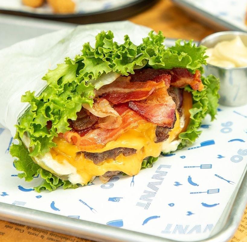 2 Tortas de carne angus usda choice, tocineta, queso americano, tomate, cebolla, pepinillos envuelta en una capa de lechuga.