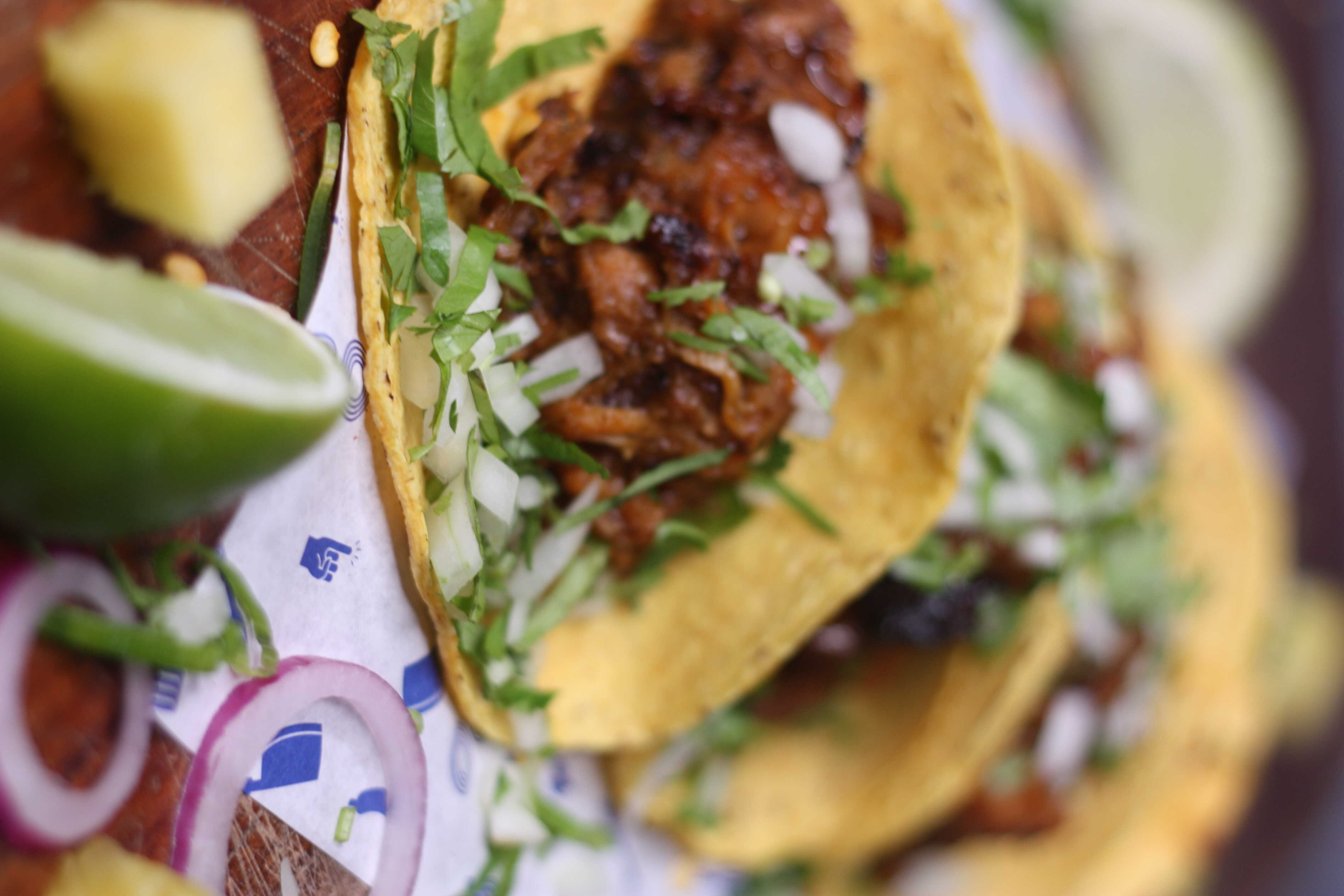 Cuatro tortillas de maíz, pulled pork, cebolla con culantro y limón.