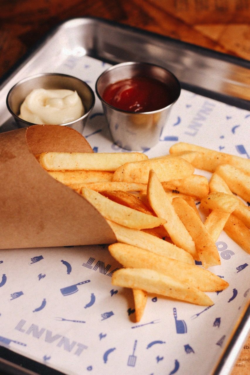 Pan brioche de masa madre, dos tortas de carne 100% angus, queso americano, lechuga, tomate, pepinillos, cebolla morada. Acompañada de papas fritas.