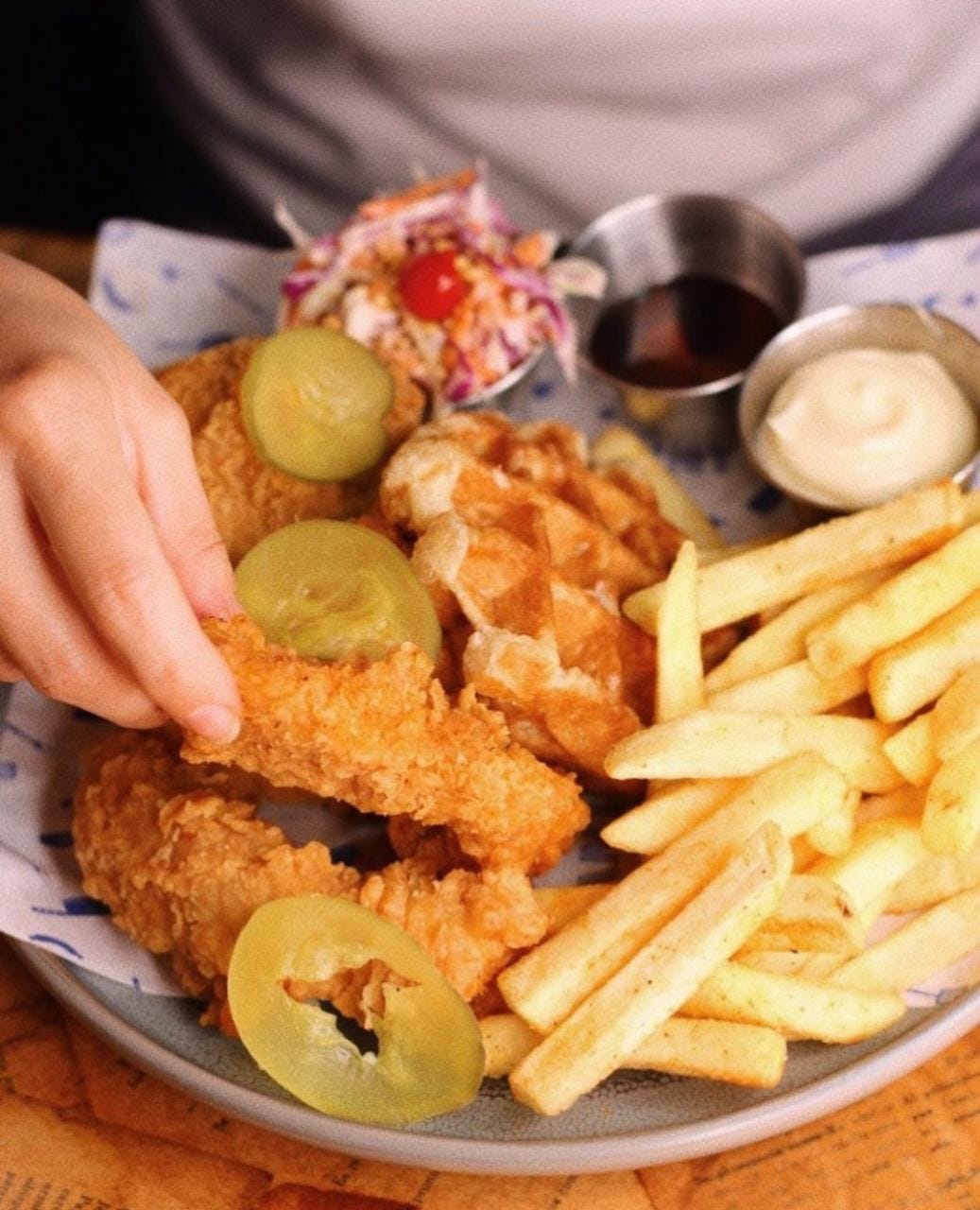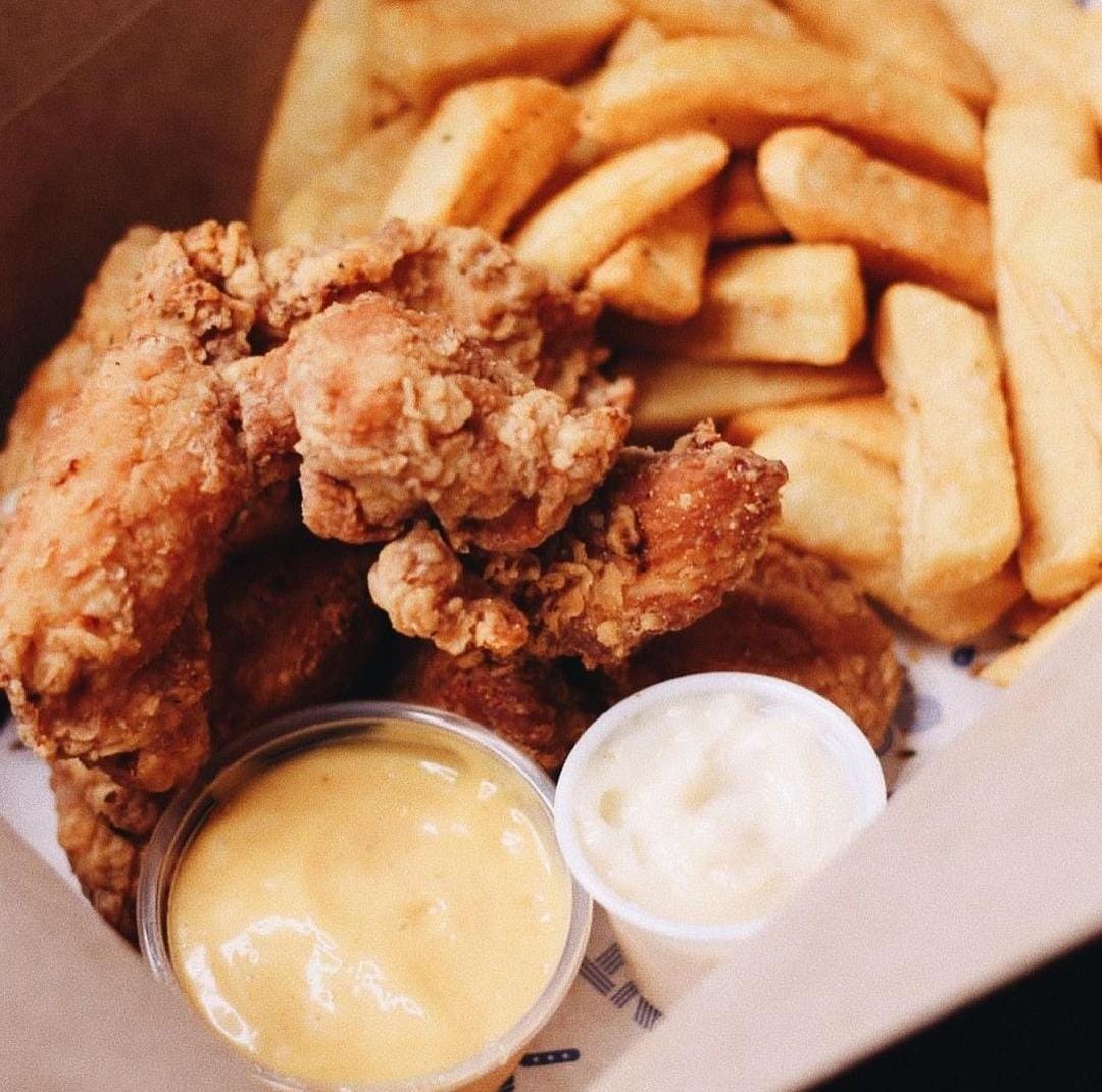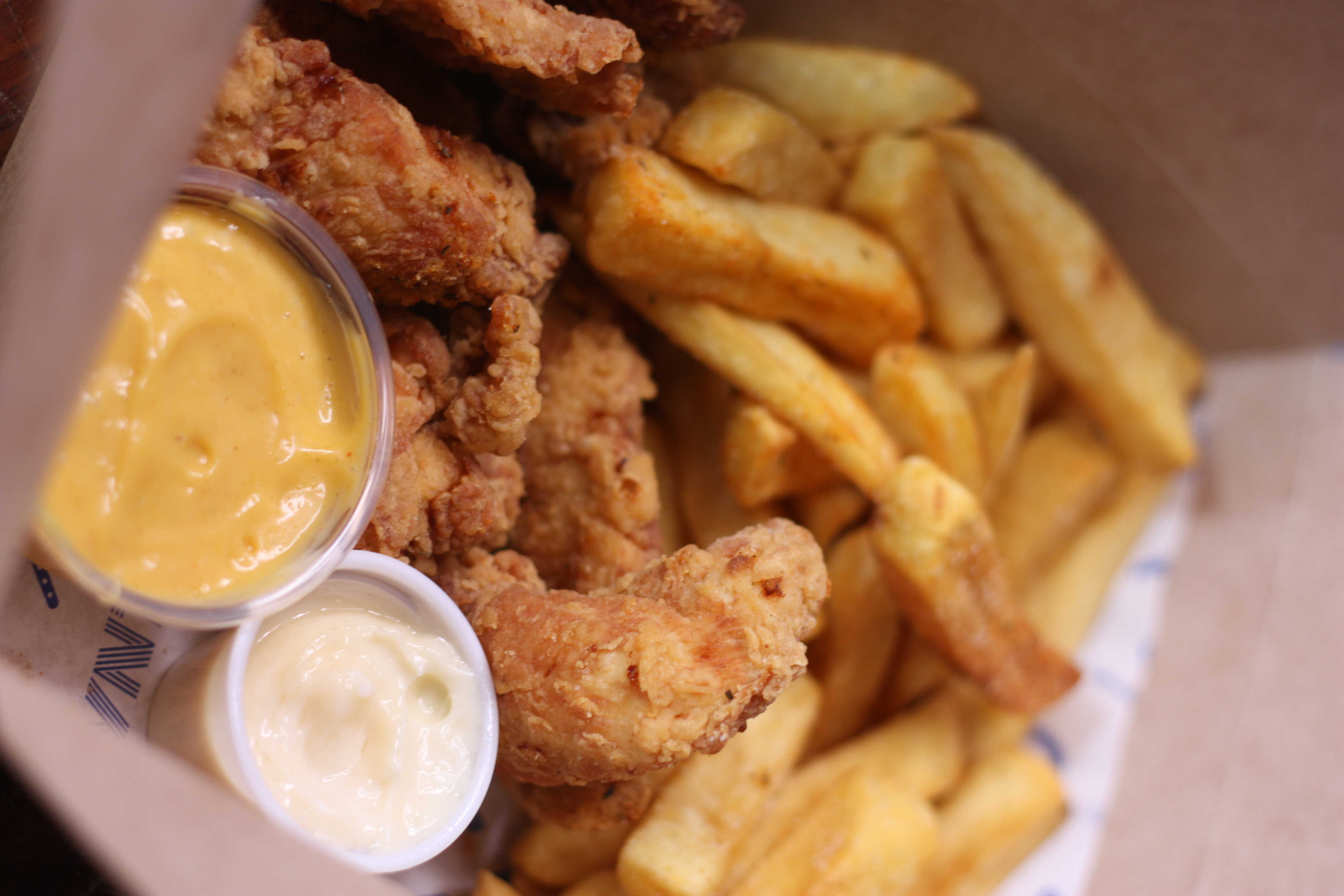 4 Deliciosos strips de pollo, acompañados de papas fritas. Porción personal.