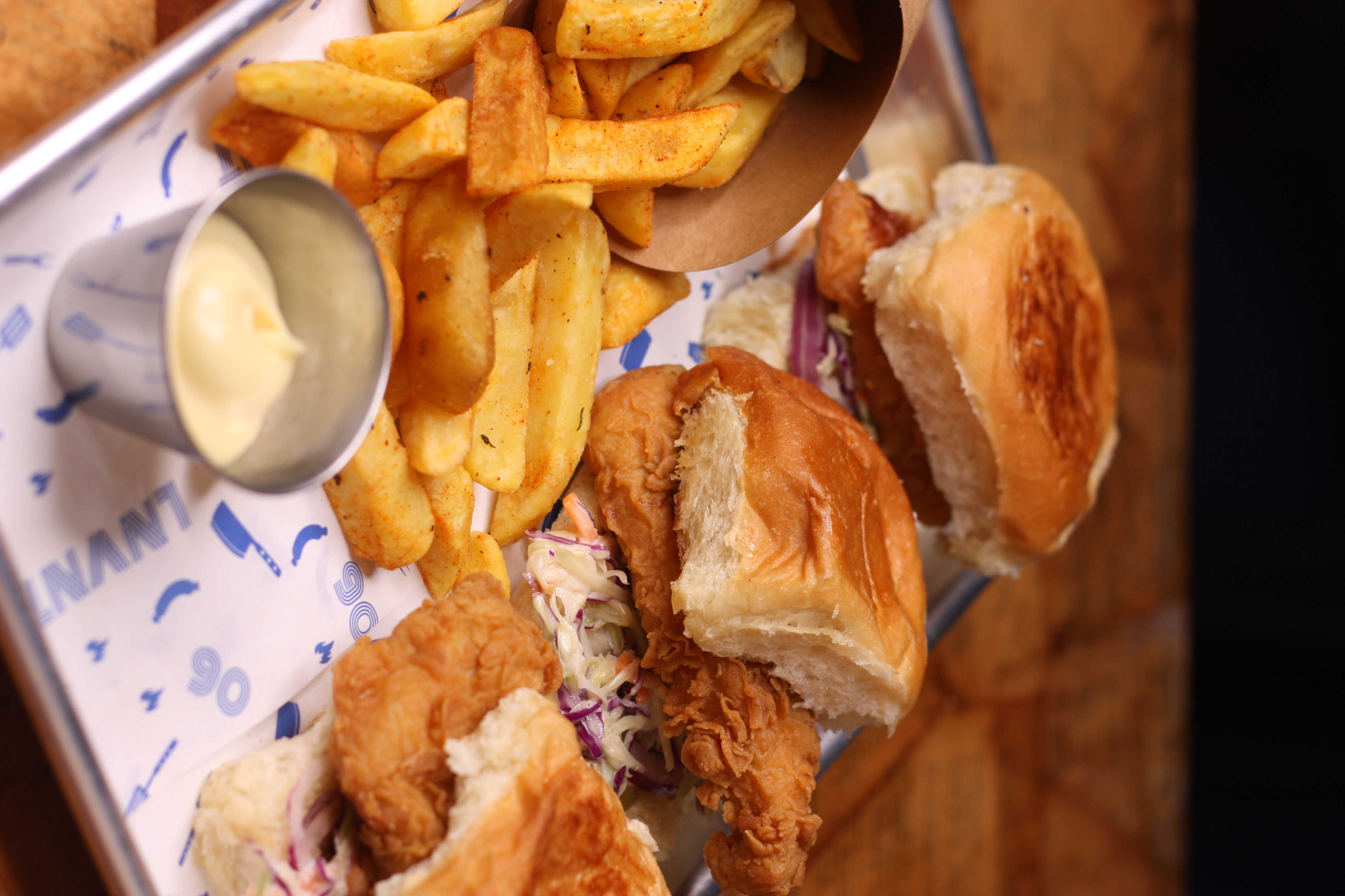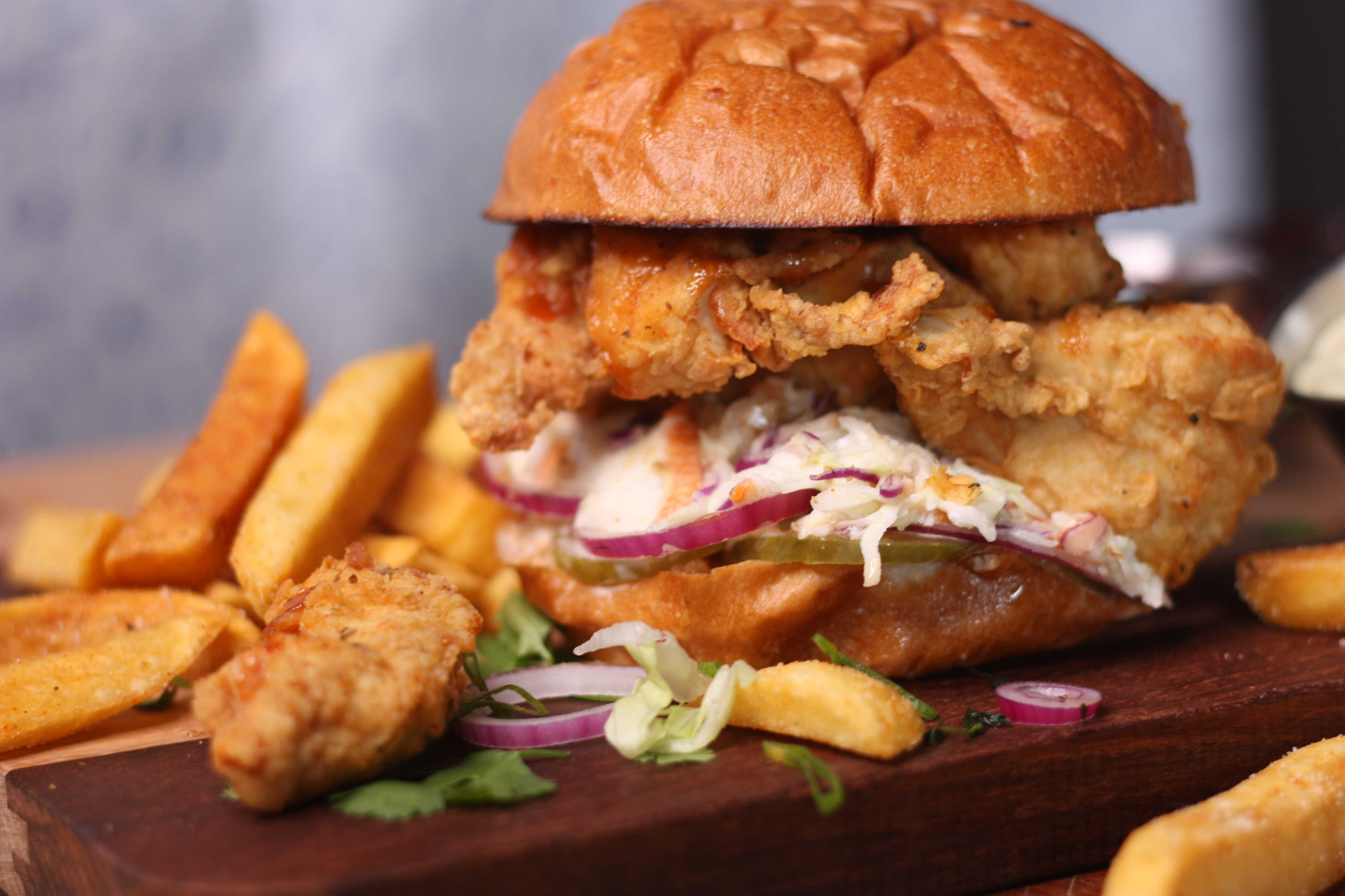 Pan brioche, pechuga de pollo empanizada, coleslaw, cebolla, pepinillos y salsa BBQ. Acompañado de papas fritas.