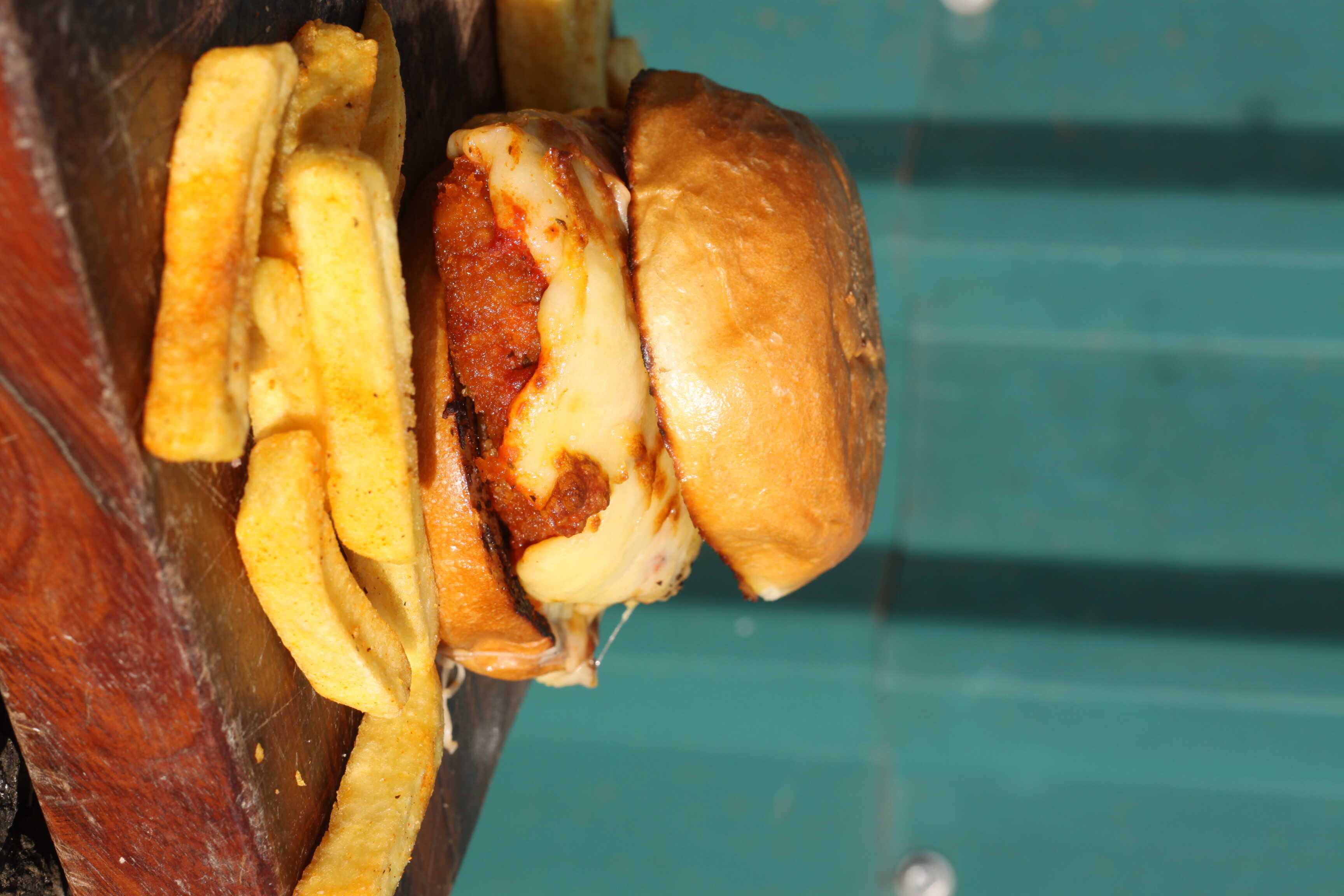 Pan brioche de masa madre, pechuga de pollo pankonizada, salsa marinara, queso gratinado. Acompañada de papas fritas.