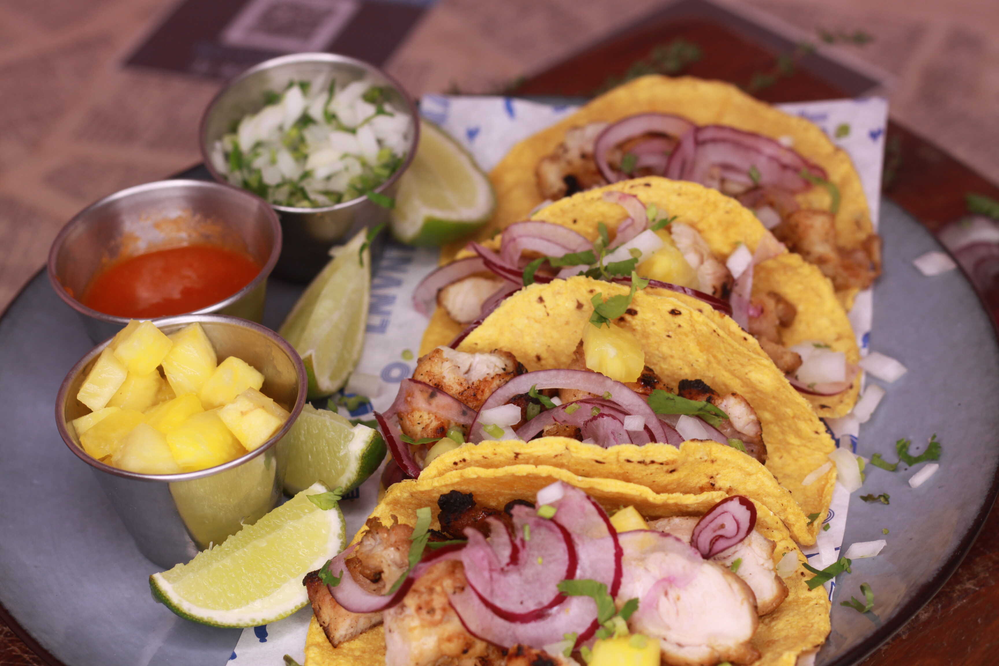Cuatro tortillas de maíz, pollo a la parrilla, cebolla con culantro, limón, piña y salsa roja con picante leve.