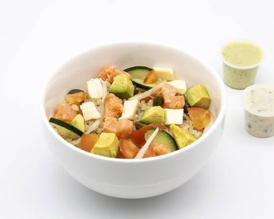 Arroz integral calientico con salmón ahumado (30 gramos), mozzarella fresca, aguacate, tomate, pepino, cebolla, alcaparras, tzatziki y aderezo de feta-hierbas.