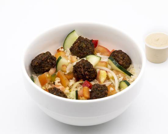Falafel, hummus, aderezo feta y hierbas, arroz, lechuga, tomate, cebolla, pepino. Con bebida y acompañamiento.