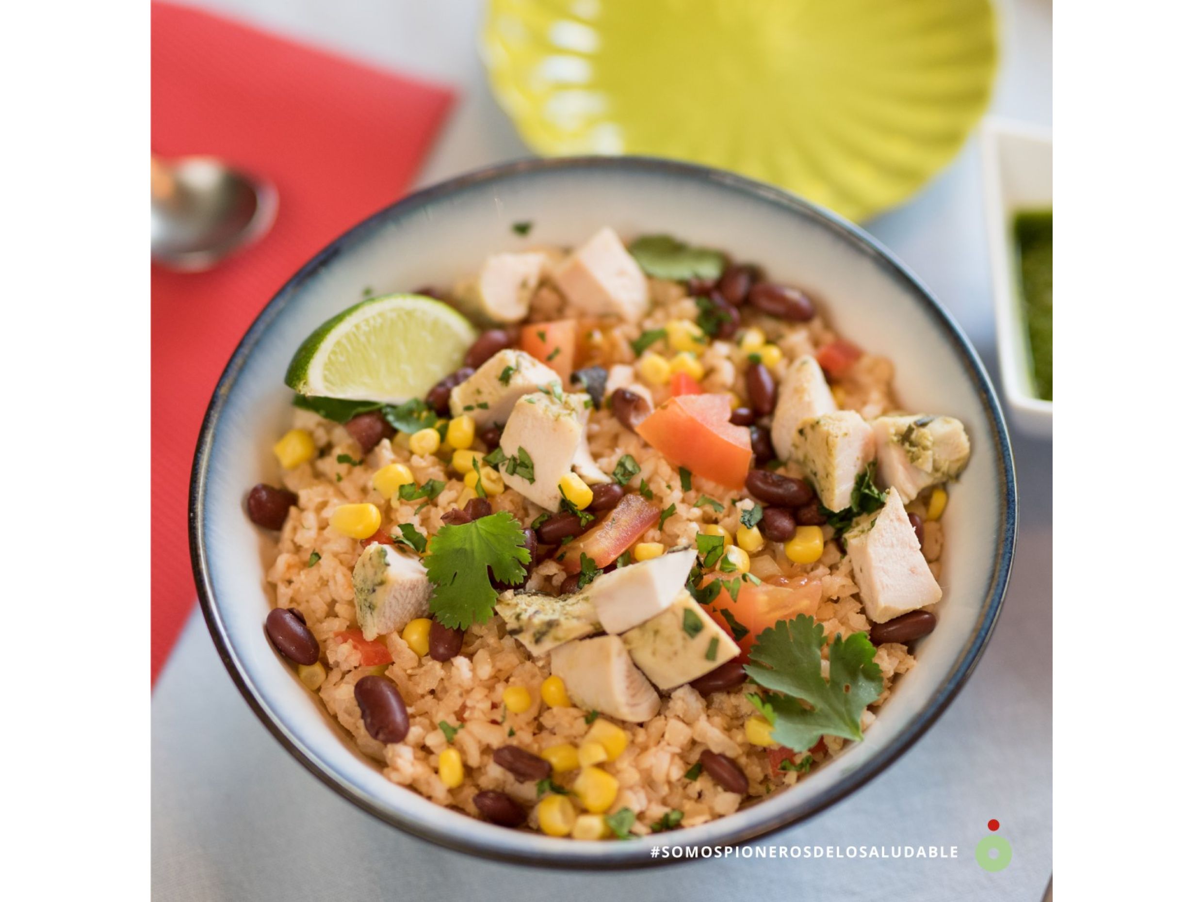 Arroz integral calientico con pollo (70 gramos), frijoles, maíz dulce, culantro fresco, tomate, chile dulce, cebolla y aderezo de chipotle.