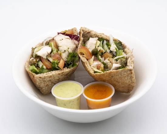 Pollo 70 gramos, aguacate, tomate, cebolla, pepino, lonjas de parmesano, alcaparras, aderezo cítrico y de feta hierbas. Acompañado con mini pita relleno con tu spread favorito.