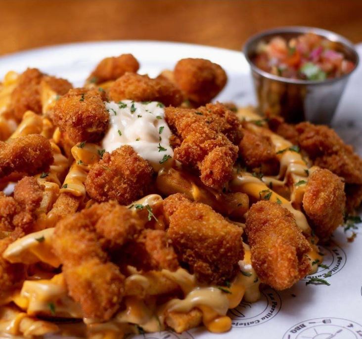 400 GRAMOS DE PAPAS FRITAS SAZONADAS,SALSA DE QUESO, SALSA DE LA CASA,NATILLA Y PICO DE GALLO,PROTEÍNA A ELEGIR ENTRE (CARNE DE RES A LA PARRILLA,PECHUGA DE POLLO A LA PARRILLA,PALOMITAS DE POLLO CRISPY,CAMARONES,PULLED PORK AHUMADO EN SALSA BBQ) (OPCIÓN VEGETARIANA, VEGETALES SALTEADOS, CHILE DULCE,CEBOLLA MORADA,HONGOS Y ZUCHINNI