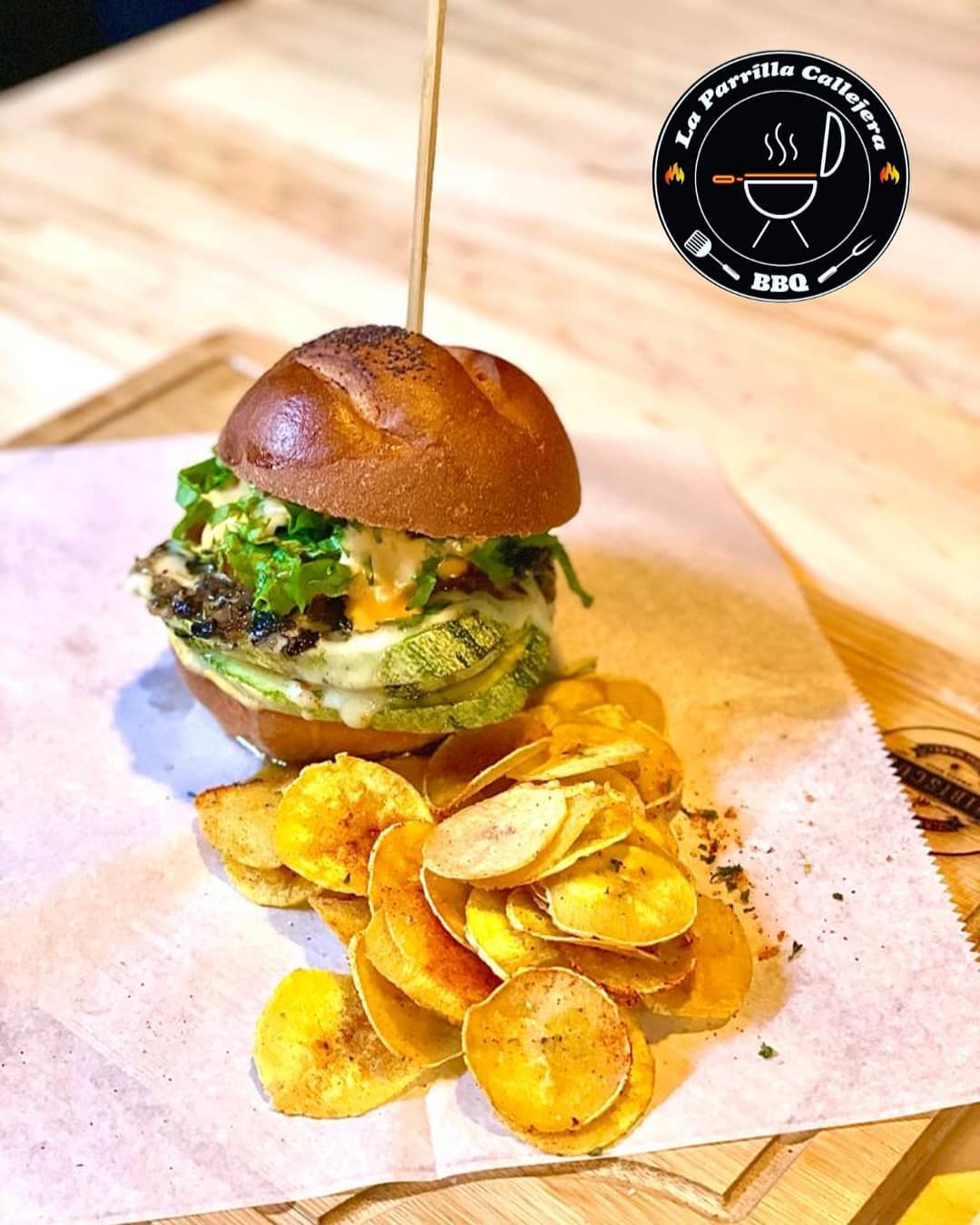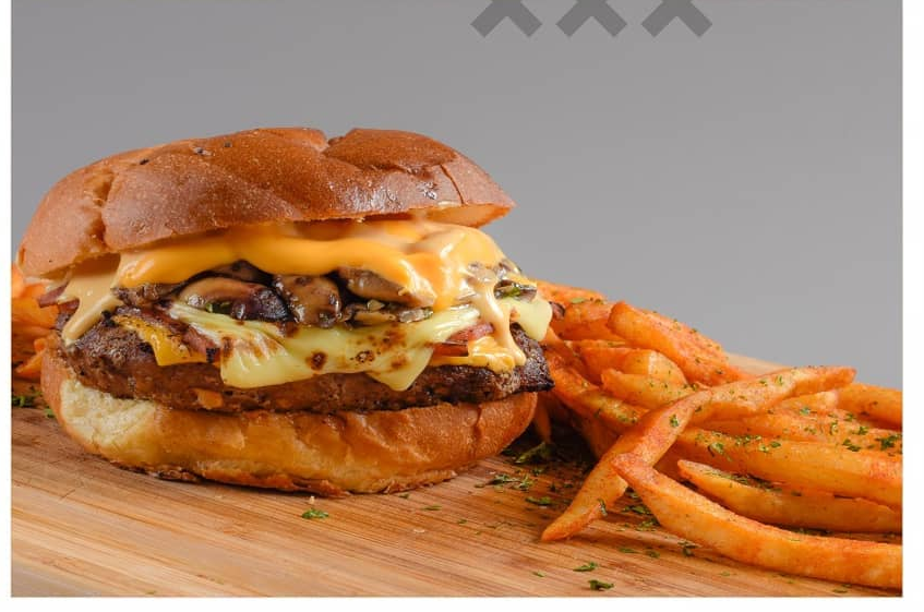 Pan de papa, zucchini, queso americano, queso mozzarella, hongos salteados, cebolla caramelizada con vinagre balsámico, tomate, pepinillos, lechuga, salsa bbq y salsa de la casa.( incluye papas fritas, yuca frita o aros de cebolla).