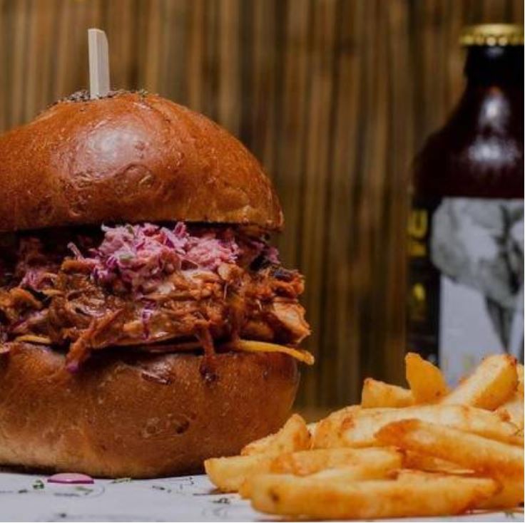 Pan de papa, carne mechada de cerdo ahumada con madera de nance, ensalada de repollo estilo americana, pepinillos dulces, chips de plátano, y salsa Bbq. Acompañada de papas fritas, yuca frita o aros de cebolla.