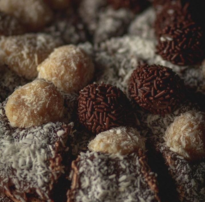 Queque de chocolate, relleno de leche condensada y coco con cobertura de chocolate brigadeiro y coco.