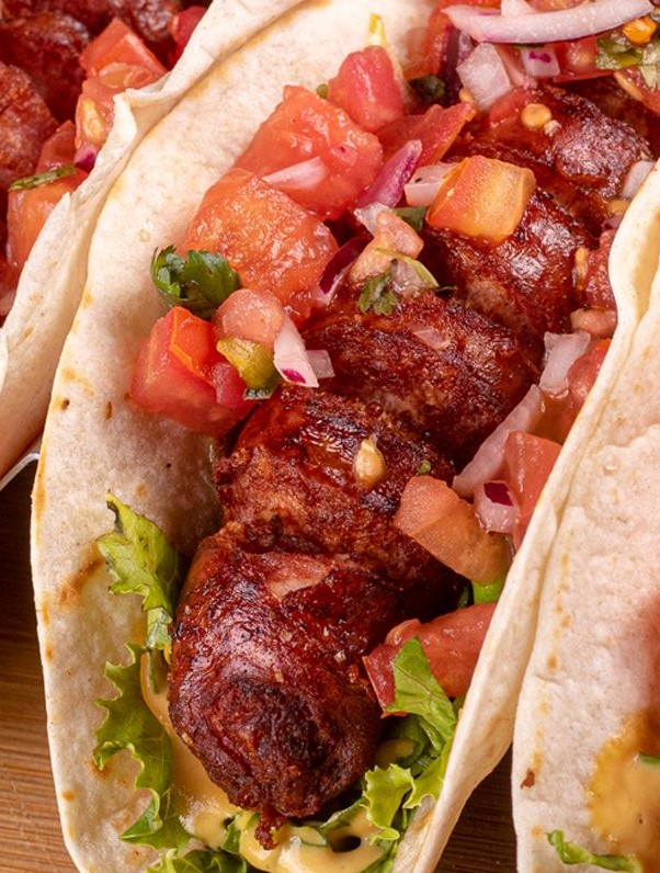Tres tacos en tortilla de harina, queso mozzarella, lechuga fresca, salsa de la casa y pico de gallo.