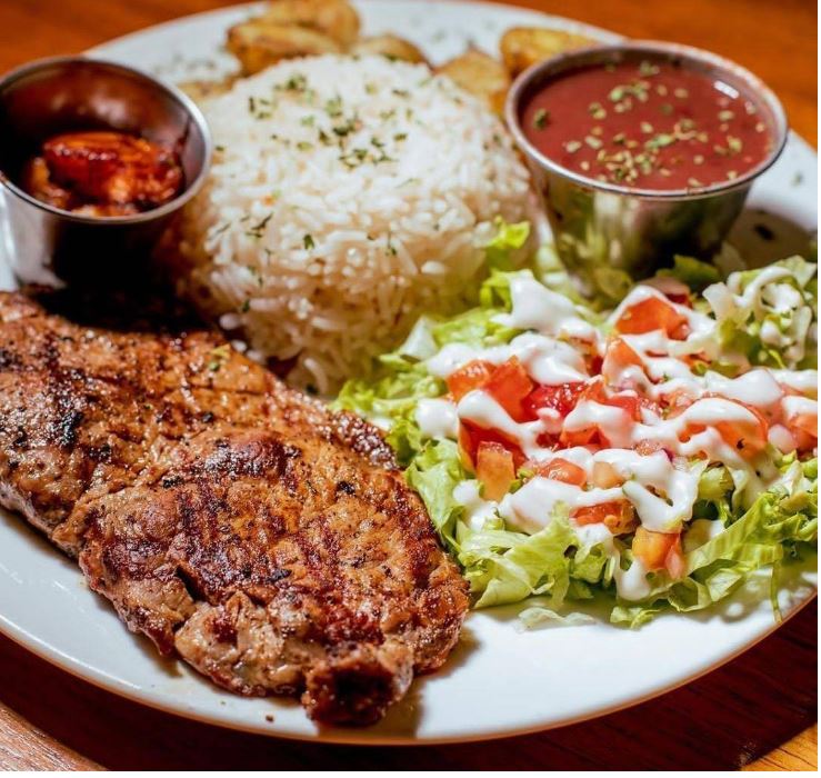Arroz, frijoles, papas salteadas, proteína a elegir, ensalada verde.